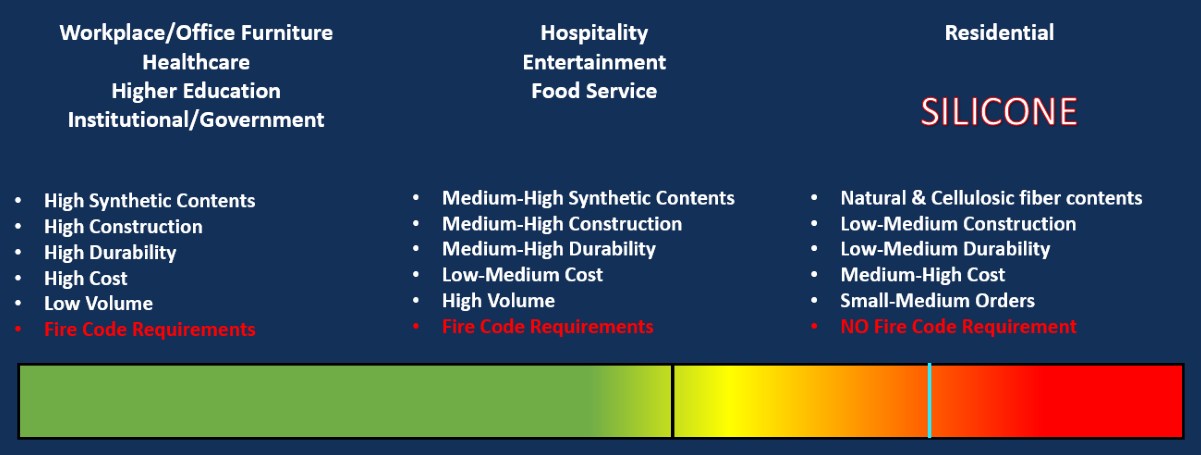 Silicone is present on some fabrics, especially residential textiles, as it is used as a softening agent during the manufacturing process. Most textiles treated with silicone will have poor performance and failure to fire codes due to the natural properties of silicone, such as it attracts oil and dirt and is flammable. The presence of silicone on a residential fabric will often contribute to, or cause, the inability to pass commercial fire codes.