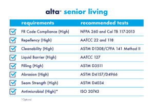 Alta™ Senior Living can be applied to all types of fabric and isn’t just specific to Senior Living facilities. If you have a fabric that needs better resistance to staining, pilling, abrasion, and improved FR code compliance, cleanability, and seam strength, this application could be for you! Alta™ senior living features a Durablock® moisture-barrier backing to prevent spills from ever penetrating below the surface, and includes an optional antimicrobial element.